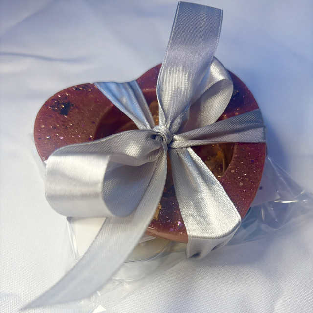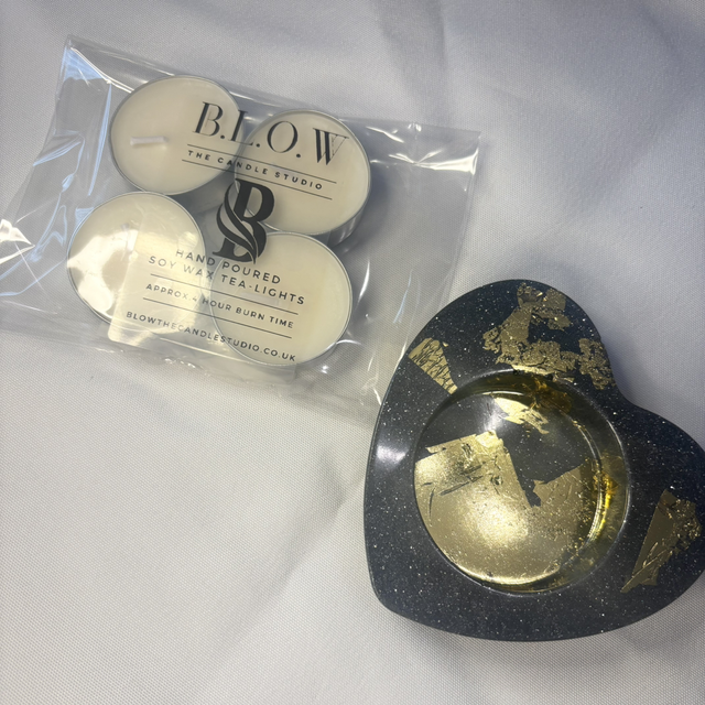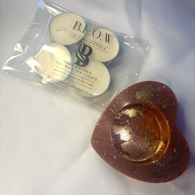 Hand made heart tea-light holder with a pack of four unscented soy wax tea-lights.
